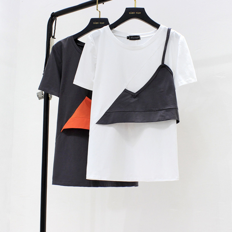 胖mm设计感吊带拼接t恤女装夏季大码宽松遮肉短袖假两件心机上衣热门设计联盟服务商