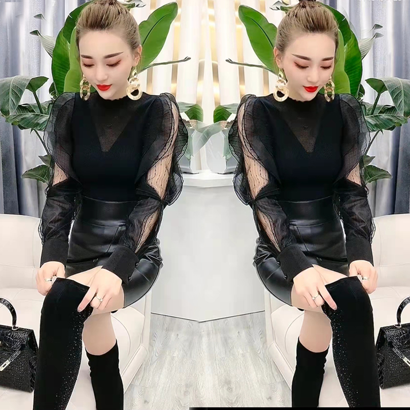 网红秋冬新款时尚百搭套装针织长袖洋气荷叶袖上衣包臀PU裙两件套热门设计联盟服务商
