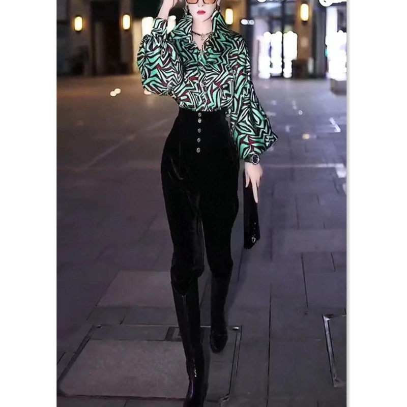 22876网红时欧货潮2022秋冬新款翻领灯笼袖衬衫高腰显瘦长裤女洋热门设计联盟服务商