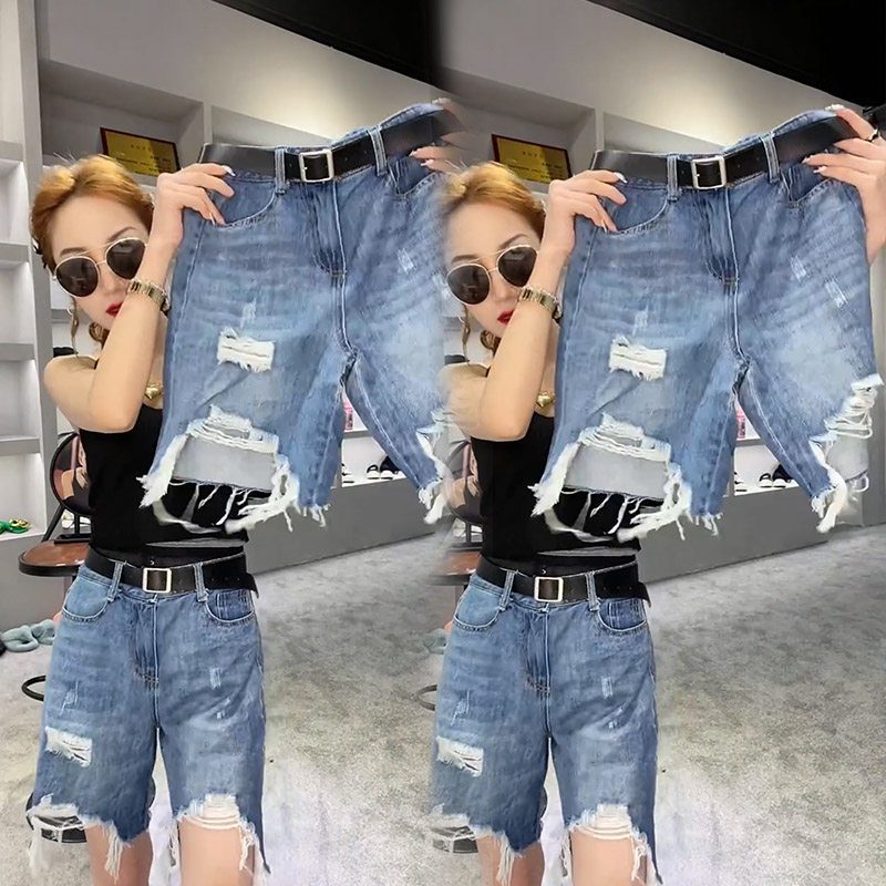 欧洲站2021夏新款破洞裤子设计感直筒宽松毛边乞丐显瘦牛仔短裤女热门设计联盟服务商