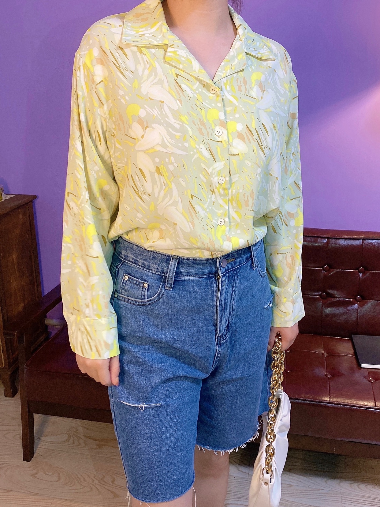 Rita|法式西装领艺术感设计感抽象印花黄绿色宽松雪纺衬衫外搭热门设计联盟服务商