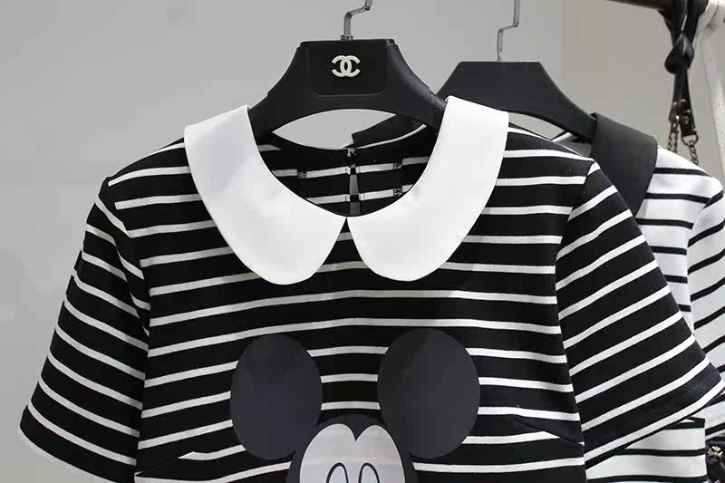 2021春夏新款黑白条纹女T恤白色娃娃领米奇贴图棉力针织大码热门设计联盟服务商