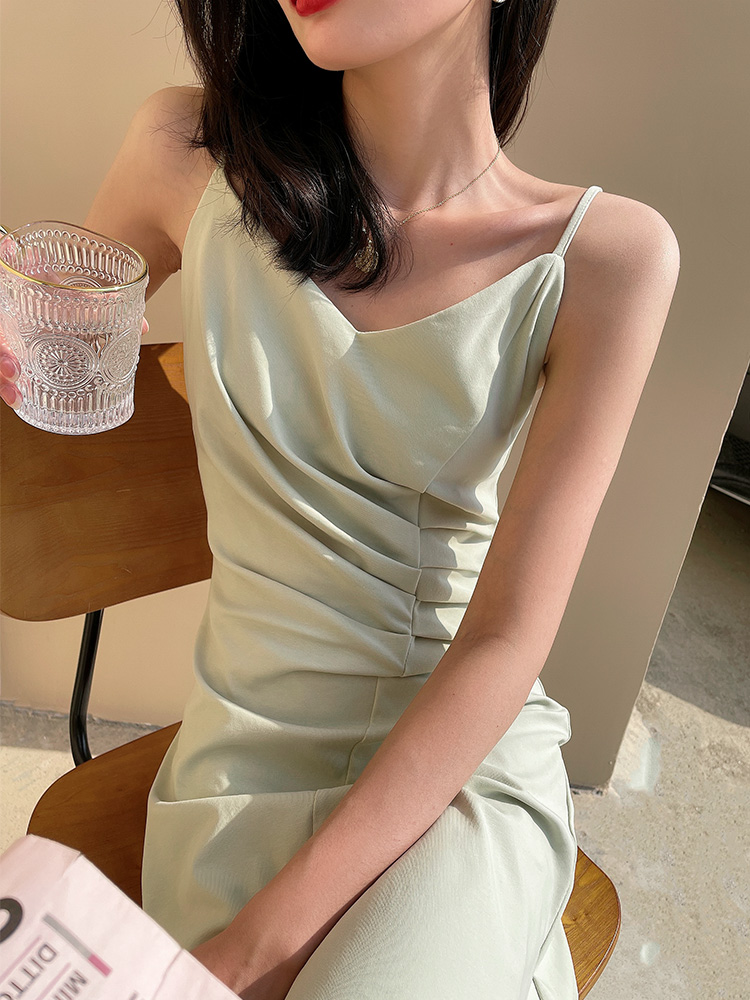 法式茶歇吊带连衣萨质内搭2021年夏季新款设计感小众性感褶皱裙热门设计联盟服务商