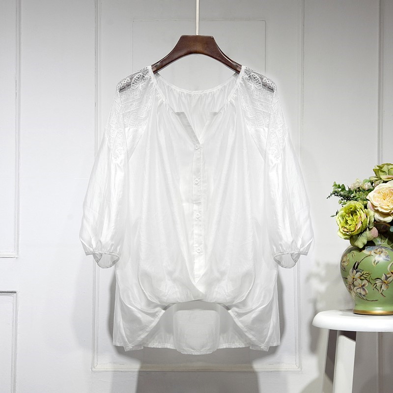 衬衫女2021夏季新款拼接蕾丝套头气质不规则设计感五分袖宽松上衣热门设计联盟服务商