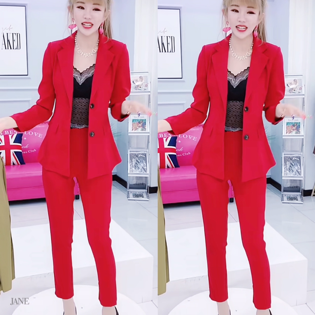 欧洲站2021春秋新款时尚一粒扣西服短外套工装小脚裤休闲两件套女热门设计联盟服务商