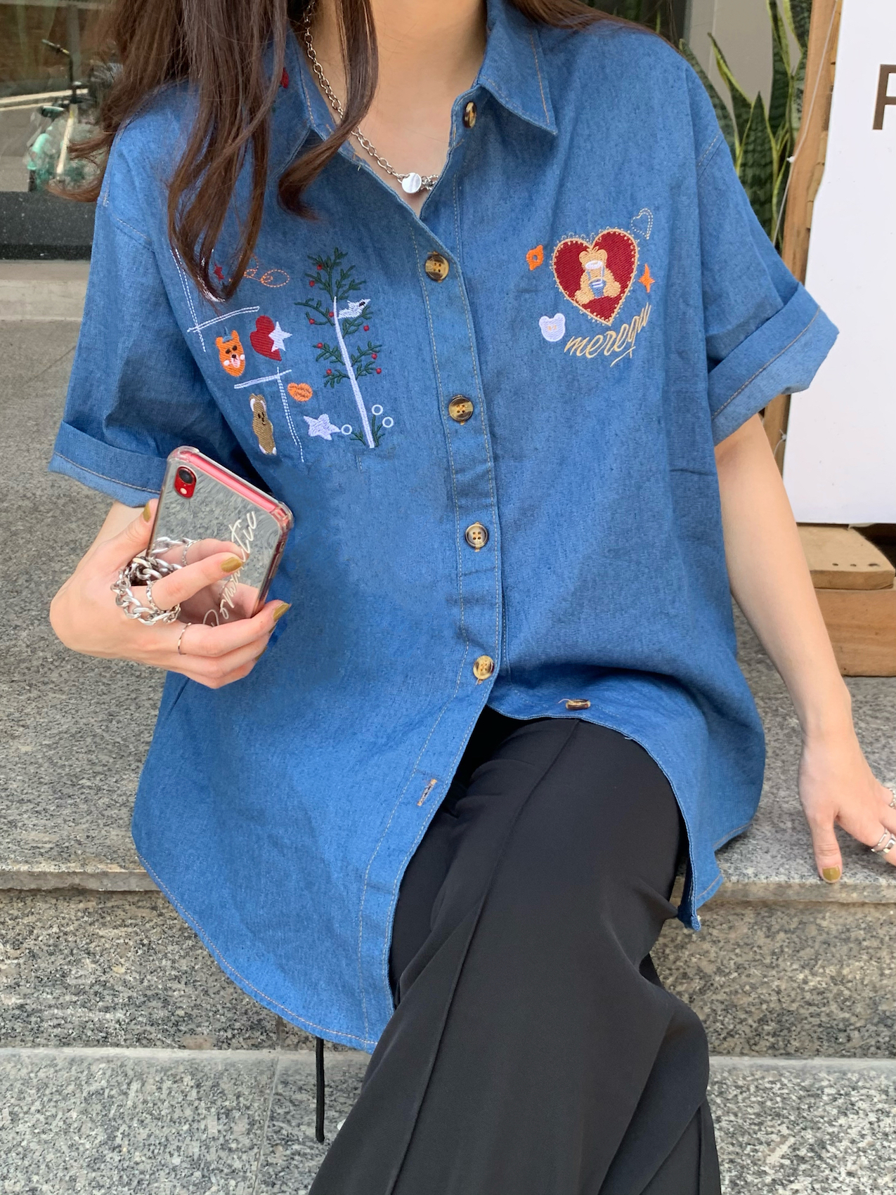 实拍实价 小熊牛仔衬衫新款刺绣设计感宽松复古短袖上衣女热门设计联盟服务商