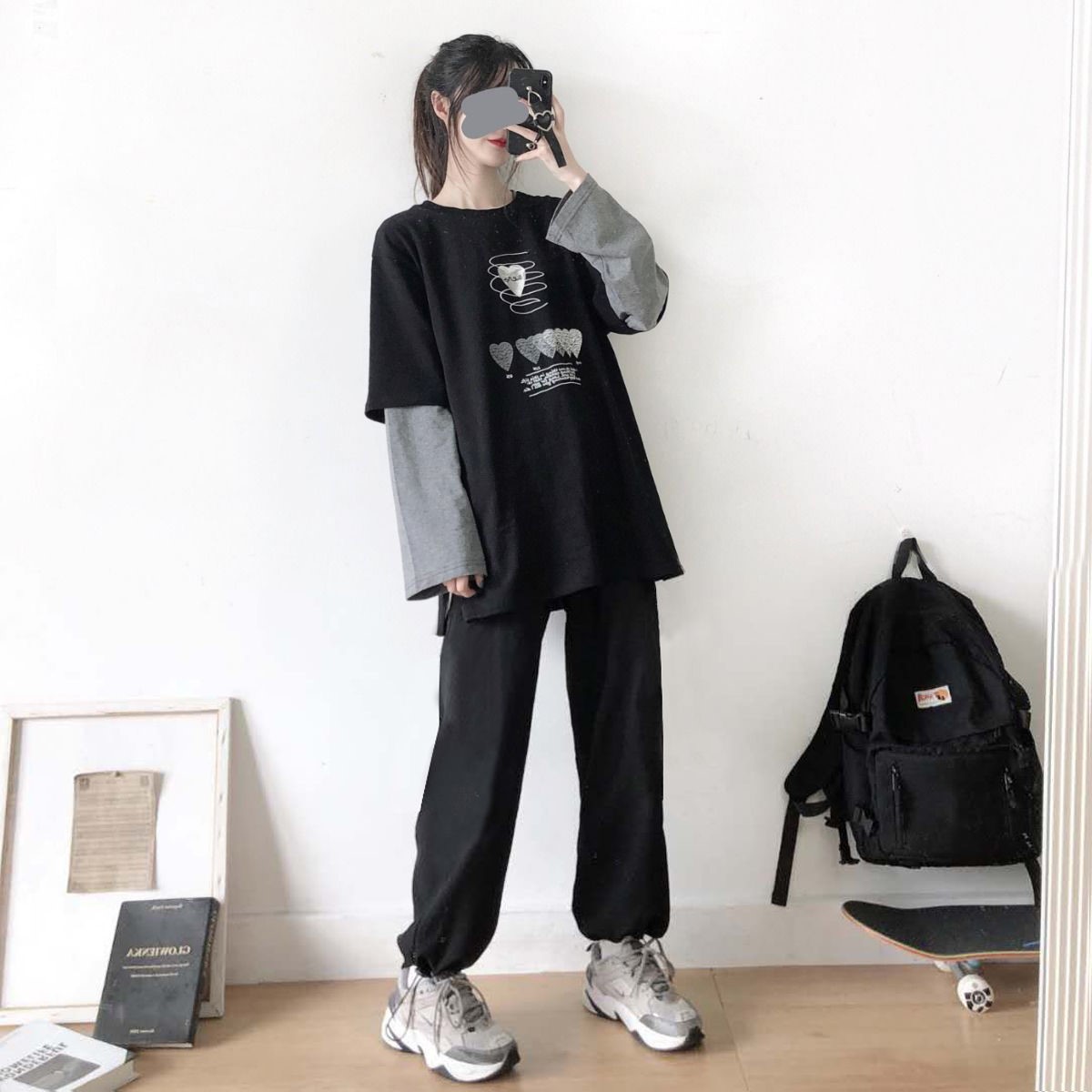 单件/套装夏秋女学生宽松韩版长袖T恤+九分束脚工装阔腿裤两件套热门设计联盟服务商