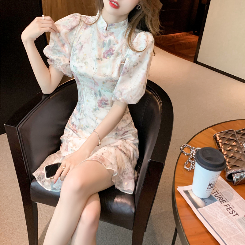 2021年夏季新款设计感印花裙改良版旗袍雪纺碎花连衣裙女热门设计联盟服务商