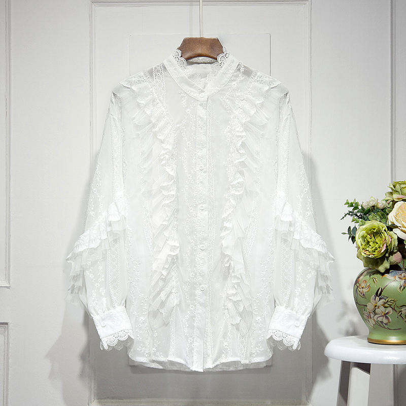 立领白色拼蕾丝花边女长袖雪纺衬衫2021春新款设计感气质超仙上衣热门设计联盟服务商
