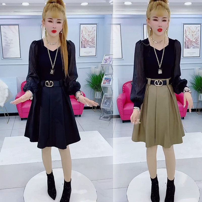 2022秋新款气质收腰减龄中长裙网红拼接圆领纱袖罗马棉A字裙欧货热门设计联盟服务商